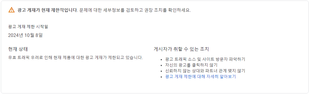 - 계정에서 무효 활동이 감지되거나 기타 문제가 발견되면 계정에 추가 시정 조치가 적용되거나 계정이 영구적 정지